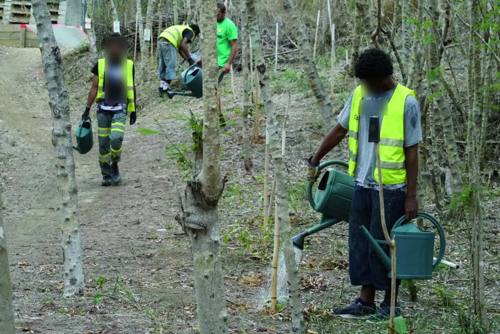 Début janvier, cinq jeunes effectuent des travaux de reboisement aux Boucles de Tina, dans le cadre de réparation pénale. Placés par décision de justice, ils doivent effectuer des heures de travaux au bénéfice de la collectivité. La province Sud les accueille au sein de cinq de ses sites : Les Boucles de Tina, le Centre d’Activités Nautiques, le stade PLGC, le Parc Provincial de la Rivière Bleue et le Parc zoologique et forestier.