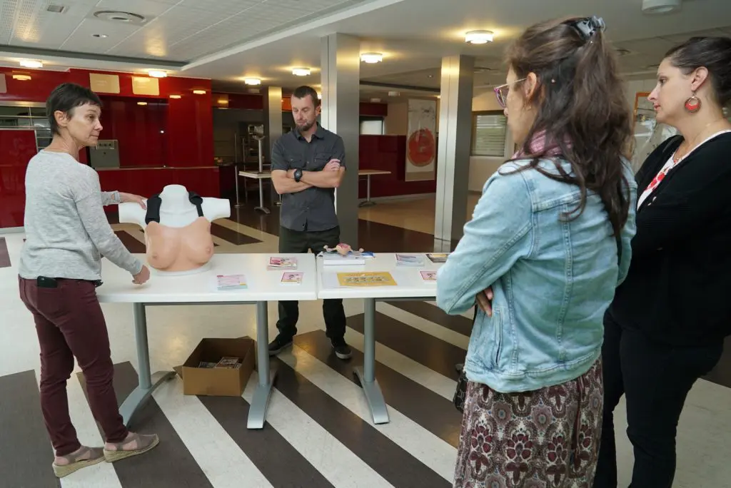 Apprendre les gestes d’autopalpation peut aider à un dépistage précoce du cancer du sein. Pour la première fois, un atelier a été proposé aux agents féminins de la collectivité durant la pause méridienne. « Le geste est simple, avec trois doigts, il suffit d’exercer un mouvement circulaire en maintenant une certaine pression pour sentir les aspérités du sein. Ne pas oublier de faire toute la surface du sein, y compris le haut de la poitrine et dans le creux de l’aisselle », souligne le docteur Grandmougin.