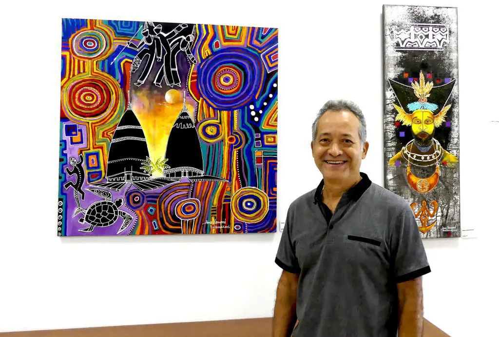 Portraits, maisons coloniales et fonds marins, Aimé Nangard expose actuellement ses toiles aux accents colorés et océaniens dans le hall de l’Hôtel de la province Sud. Lauréat de l’aide à la création artistique en 2020 puis de l’aide à l’exposition en 2021, il revient sur son parcours, ses inspirations et cette passion qui l’anime depuis petit.