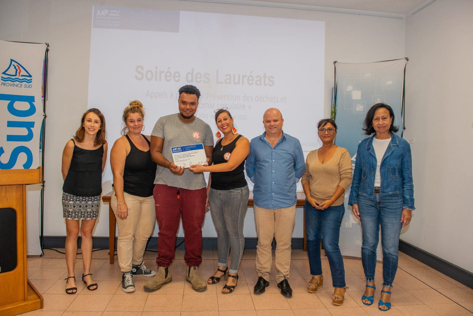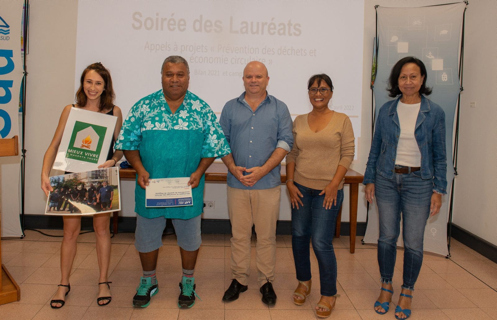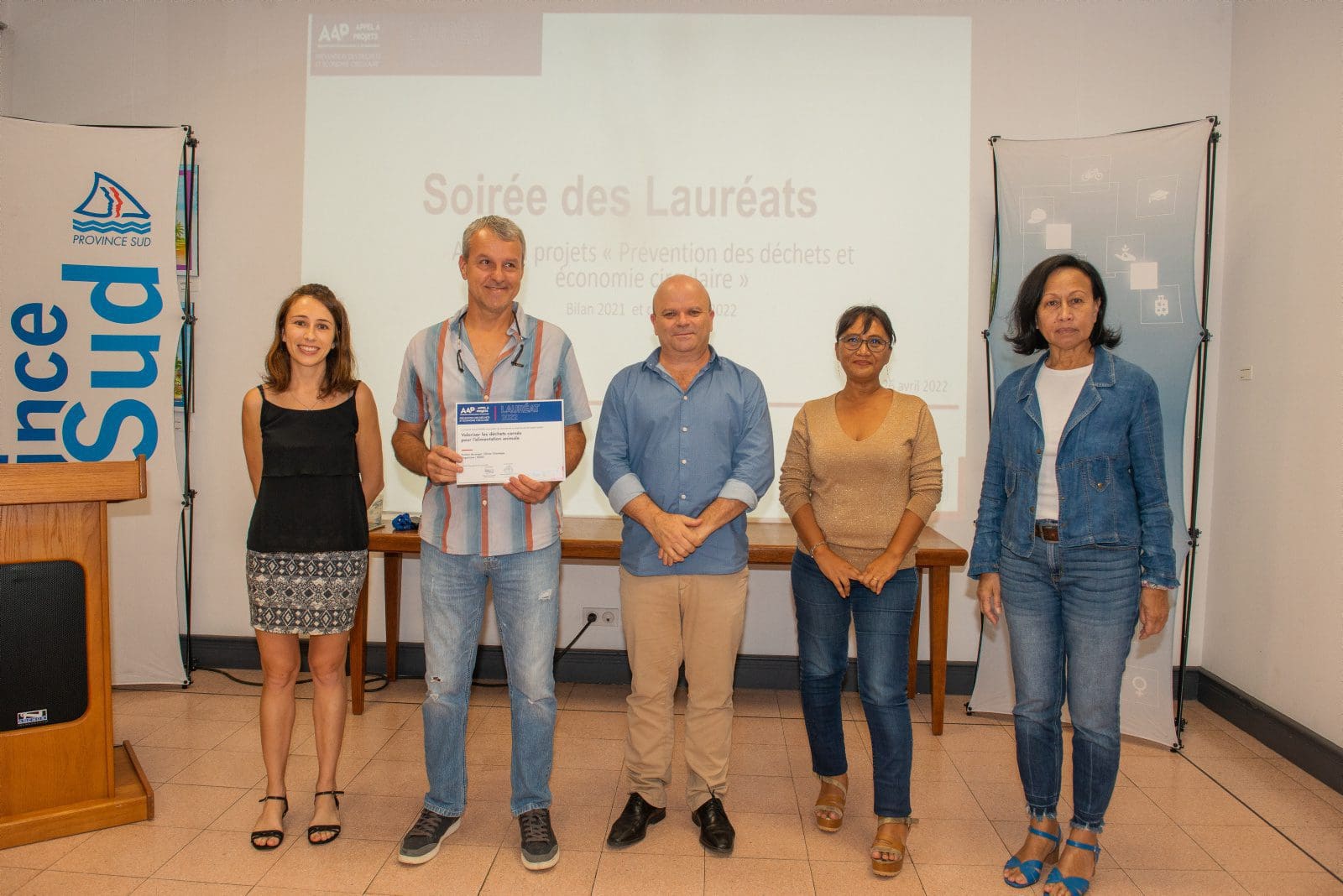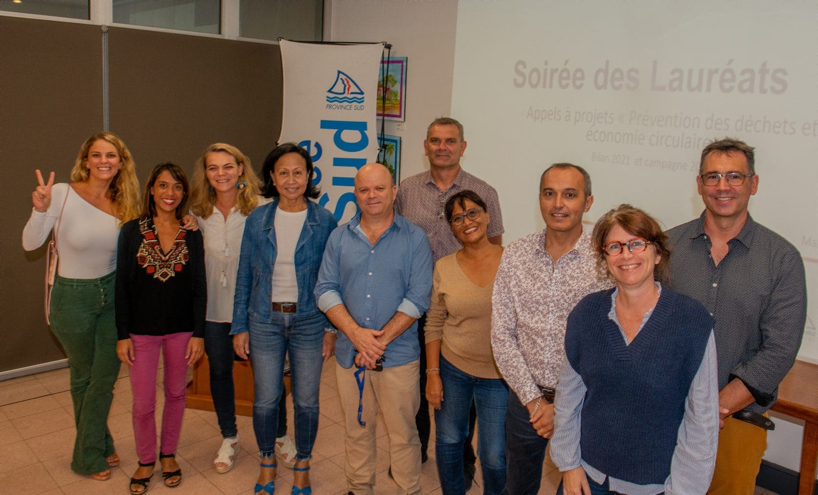Hier soir, Philippe Blaise, le premier vice-président de la province Sud, et les élues provinciales, Françoise Suve, rapporteur de la commission de l’environnement et Christiane Saridjan-Verger, membre de cette même commission, ont eu le plaisir de récompenser 21 lauréats 2021 et 5 lauréats 2020 de l’appel à projet AAP Economie circulaire, lancé par la province Sud et l’ADEME. Une soirée des lauréats qui s’est déroulée dans le hall de l’Hôtel de la province Sud et qui a mis à l’honneur des projets eco-responsables pour une meilleure prévention et gestion des déchets en faveur d’une économie verte et durable.