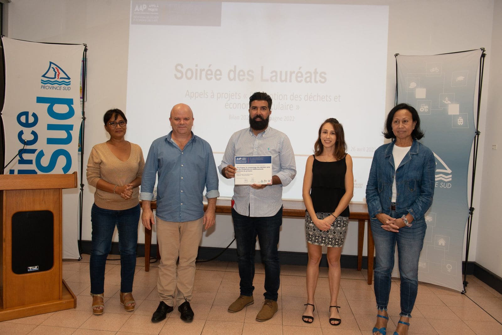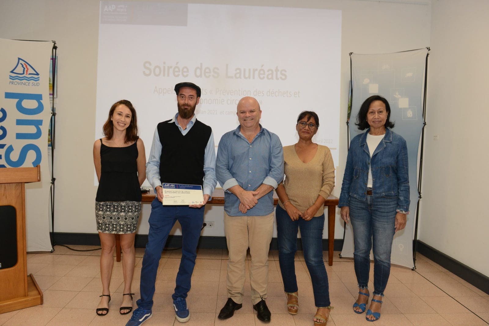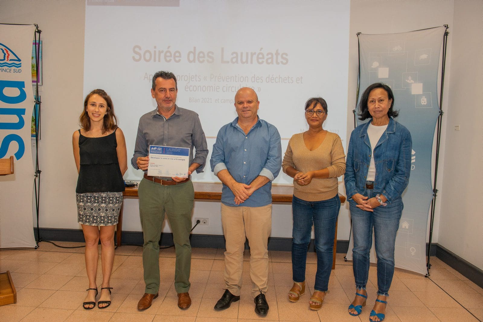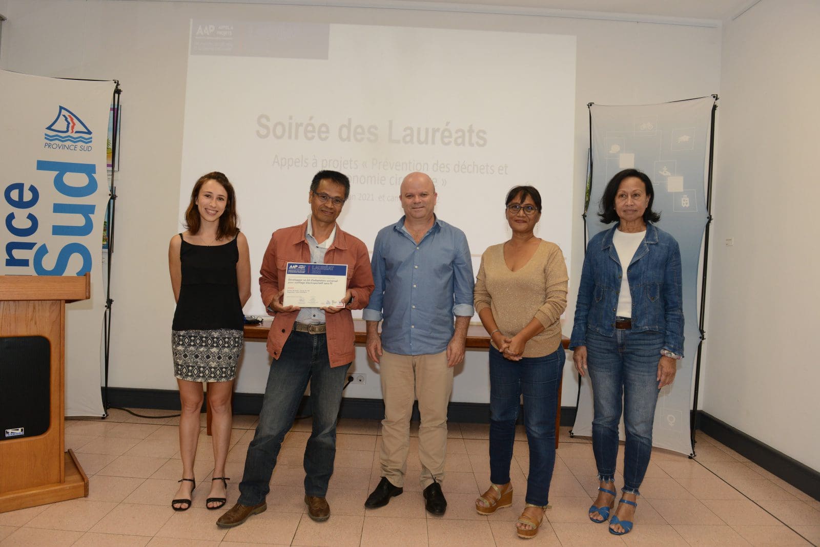 Hier soir, Philippe Blaise, le premier vice-président de la province Sud, et les élues provinciales, Françoise Suve, rapporteur de la commission de l’environnement et Christiane Saridjan-Verger, membre de cette même commission, ont eu le plaisir de récompenser 21 lauréats 2021 et 5 lauréats 2020 de l’appel à projet AAP Economie circulaire, lancé par la province Sud et l’ADEME. Une soirée des lauréats qui s’est déroulée dans le hall de l’Hôtel de la province Sud et qui a mis à l’honneur des projets eco-responsables pour une meilleure prévention et gestion des déchets en faveur d’une économie verte et durable.