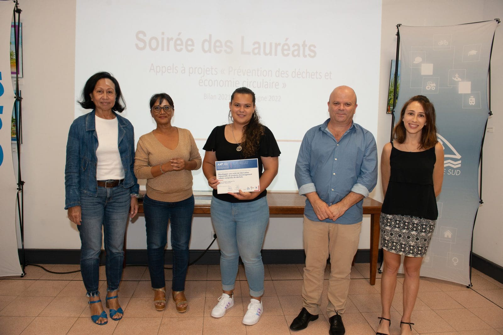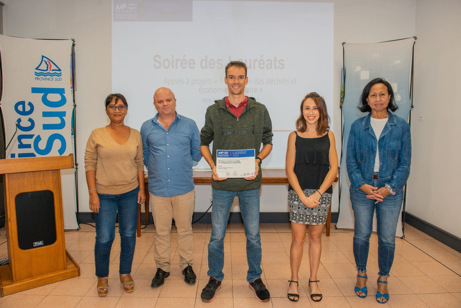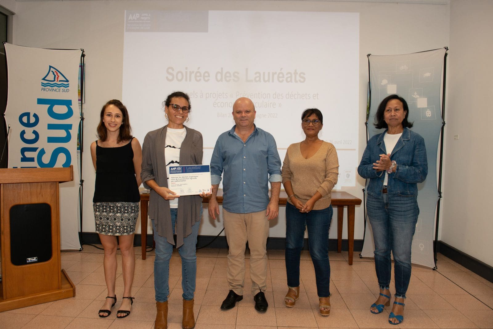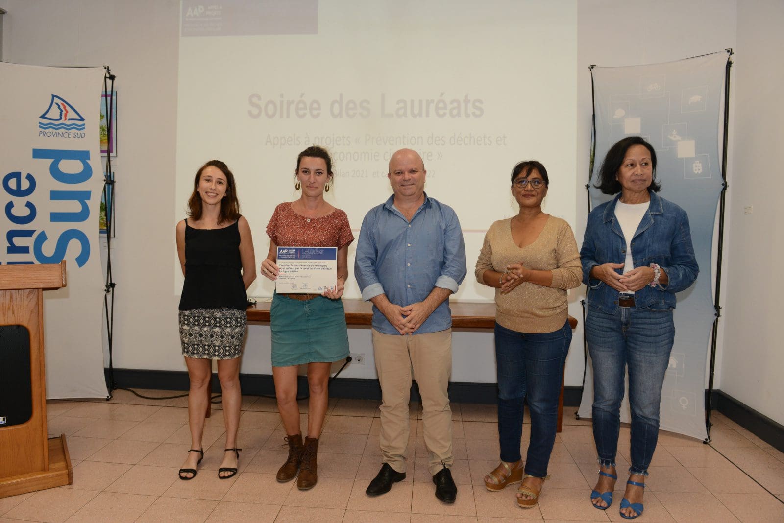 Hier soir, Philippe Blaise, le premier vice-président de la province Sud, et les élues provinciales, Françoise Suve, rapporteur de la commission de l’environnement et Christiane Saridjan-Verger, membre de cette même commission, ont eu le plaisir de récompenser 21 lauréats 2021 et 5 lauréats 2020 de l’appel à projet AAP Economie circulaire, lancé par la province Sud et l’ADEME. Une soirée des lauréats qui s’est déroulée dans le hall de l’Hôtel de la province Sud et qui a mis à l’honneur des projets eco-responsables pour une meilleure prévention et gestion des déchets en faveur d’une économie verte et durable.
