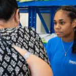 Léana, job d’été à Teeprint et Patricia, une maman venue acheter un kit.