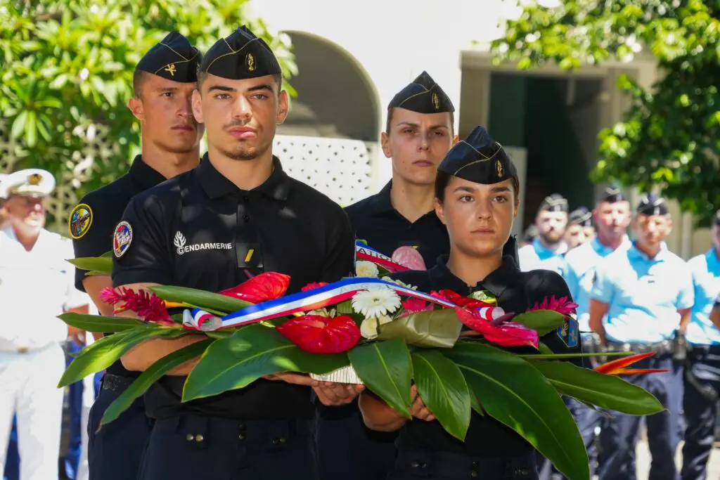 Les autorités civiles et militaires ont été accueillies par le général Nicolas Matthéos, commandant de la gendarmerie pour la Nouvelle-Calédonie et les îles Wallis et Futuna. Parmi les personnalités présentes, Jean-Gabriel Favreau, élu de la province Sud est venu représenter la présidente Sonia Backes.